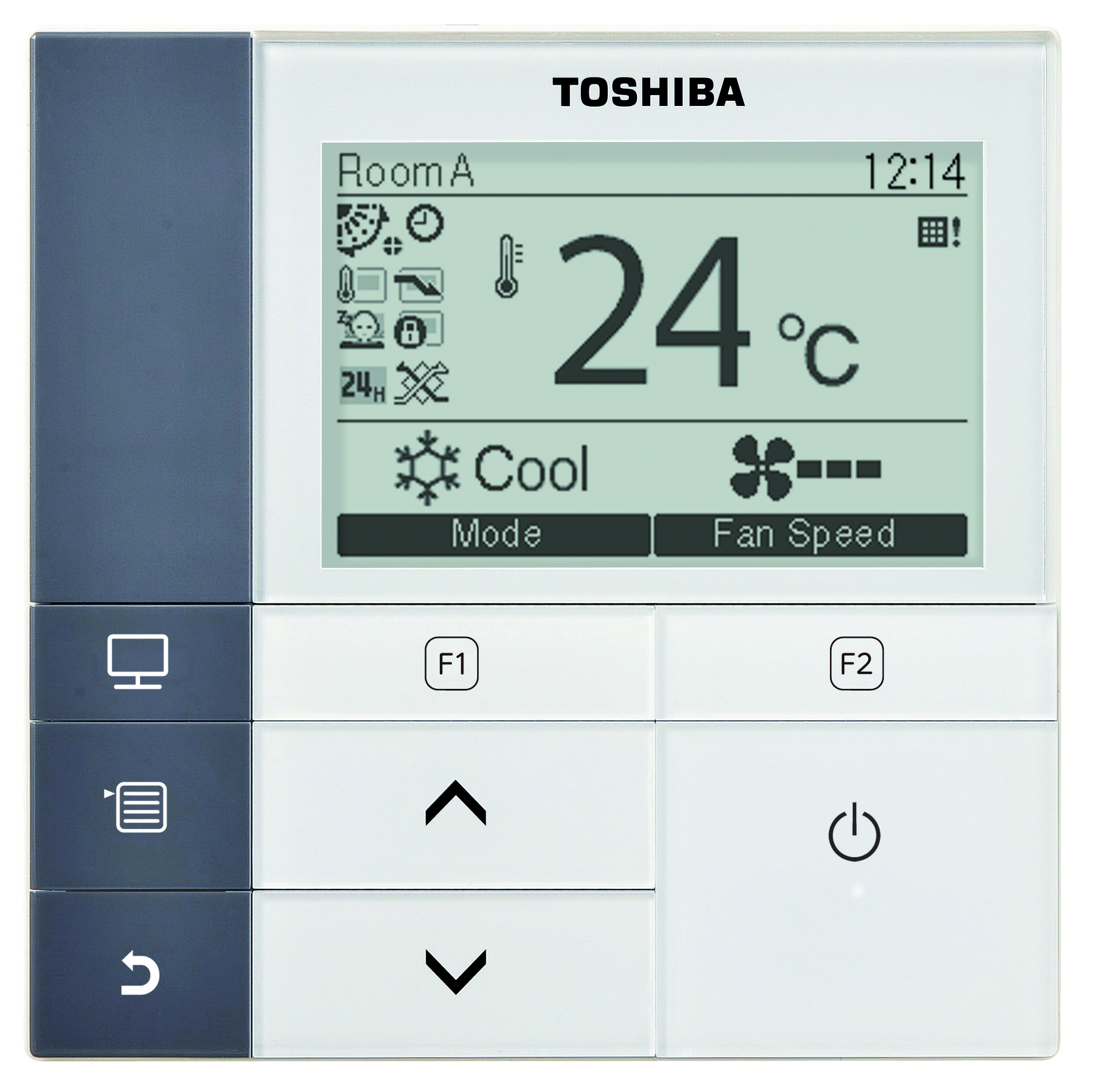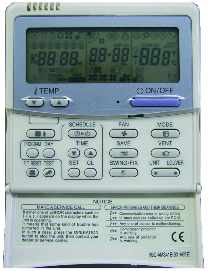 Osnovne karakteristike: LCD display, digitalno namještanje temperature, odabir režima rada, biranje između 3 brzine ventilatora, tjedni programator s mogućnošću postavljanja do 8 programa za svaki dan u tjednu, zaključavanje tipkovnice, sobni temperaturni senzor, paralelno upravljanje do 8 unutarnjih jedinica, dijagnoza greške, filter upozorenja.